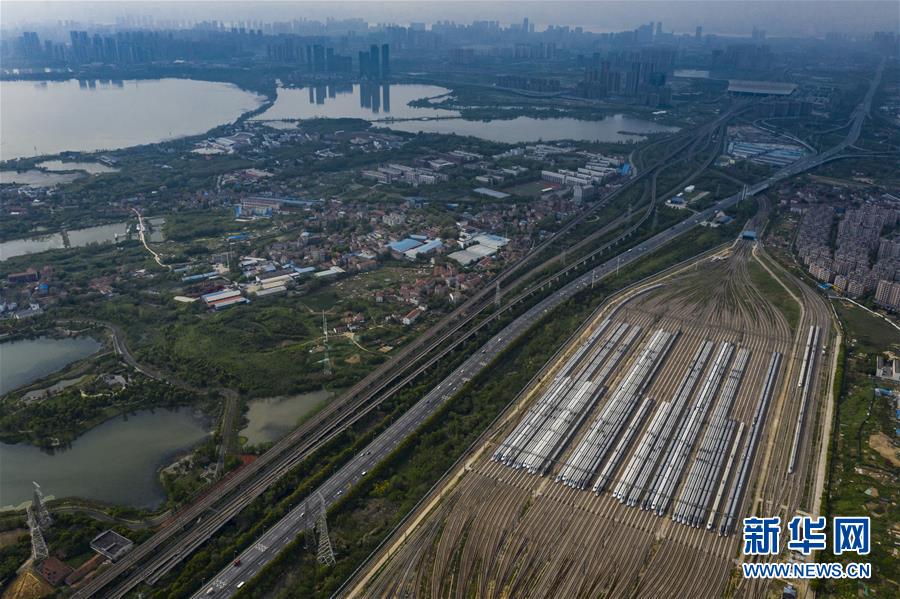 4月7日,在武漢動車段,列車??吭诖孳嚲€上(無人機照片)。新華社記者 沈伯韓 攝