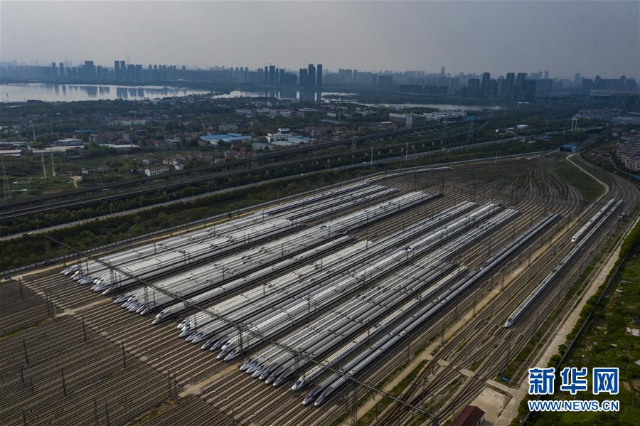 4月7日,在武漢動(dòng)車段,列車??吭诖孳嚲€上(無(wú)人機(jī)照片)。新華社記者 沈伯韓 攝