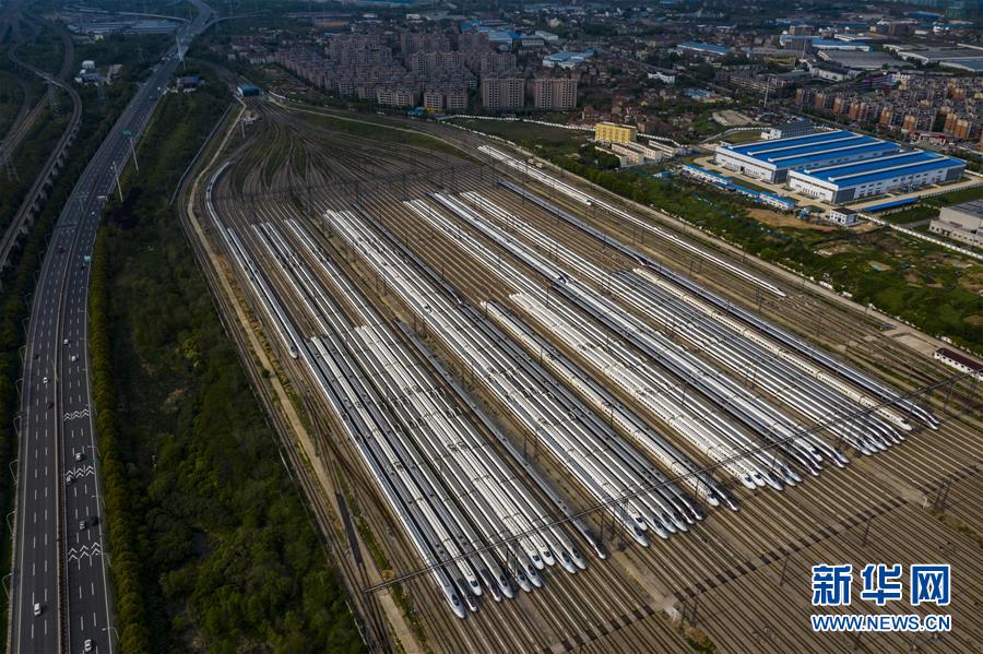 4月7日,在武漢動車段,列車??吭诖孳嚲€上(無人機照片)。新華社記者 沈伯韓 攝