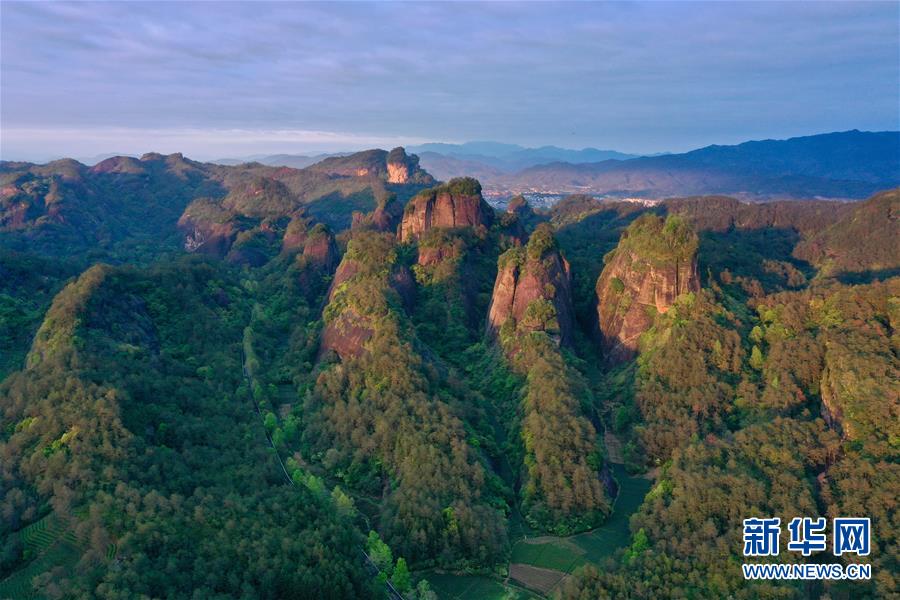 這是夕陽照射下的武夷山國家公園丹霞群巒(4月1日攝,無人機(jī)照片)。新華社記者姜克紅攝