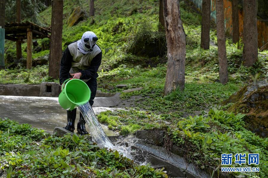 4月14日,中國大熊貓保護研究中心核桃坪基地的飼養(yǎng)員周季秋身著涂抹了稀釋后大熊貓尿液的“熊貓偽裝服”,在大熊貓活動場內打掃衛(wèi)生。新華社記者張超群攝