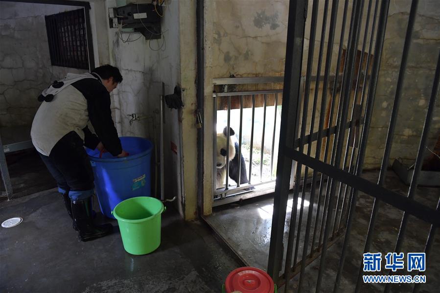 4月14日,中國大熊貓保護研究中心核桃坪基地飼養(yǎng)員周季秋在大熊貓“喜妹”的圈舍內打掃衛(wèi)生。新華社記者張超群攝