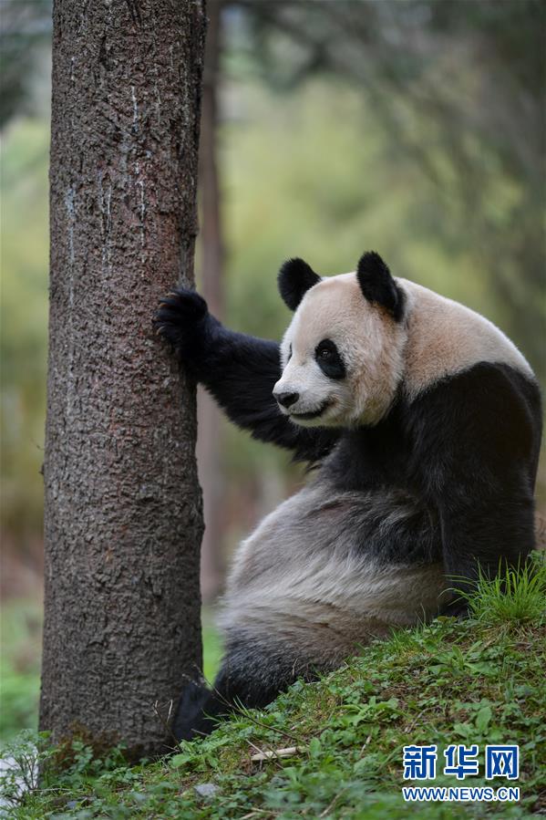 4月14日,大熊貓“喜妹”在中國大熊貓保護研究中心核桃坪基地活動場內。新華社記者張超群攝