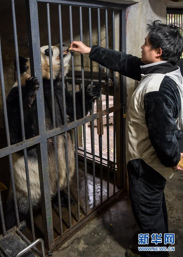 4月14日,中國大熊貓保護(hù)研究中心核桃坪基地飼養(yǎng)員周季秋用投喂窩窩頭的方法訓(xùn)練大熊貓“喜妹”的下肢力量。新華社記者張超群攝