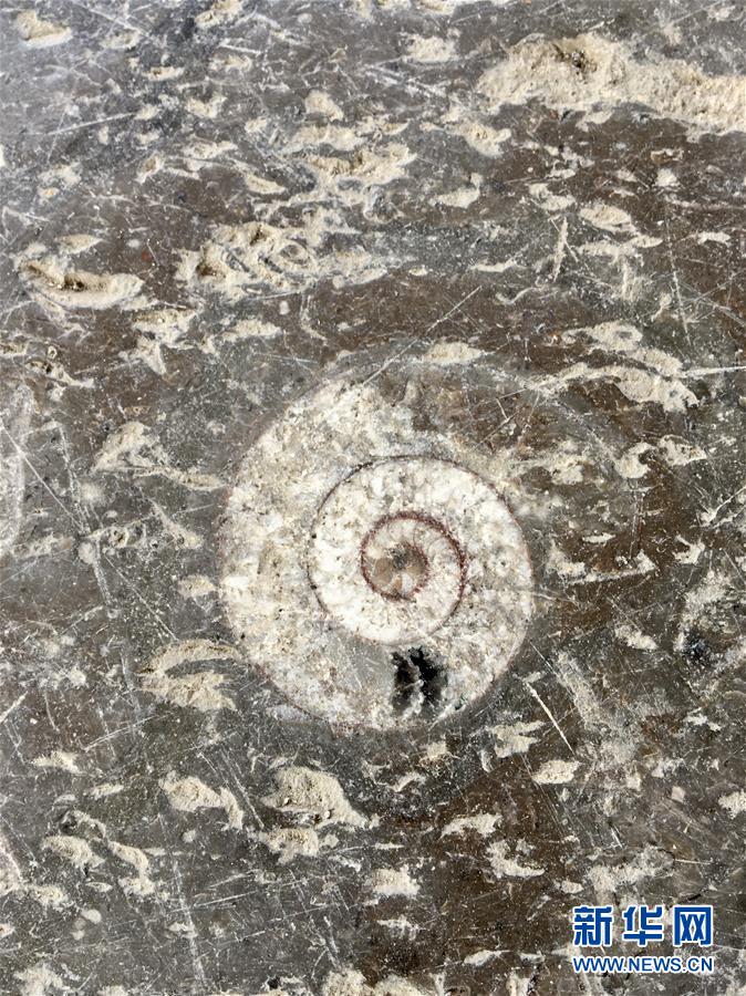這是4月9日在張家界市區(qū)一路面拍攝的遠古海洋生物化石地板。新華社記者蘇曉洲攝