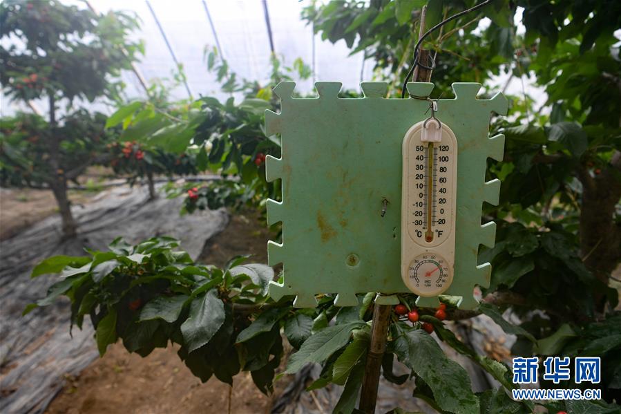 這是4月15日在特克斯礪劍鋒農(nóng)林科技有限公司赤谷新城休閑觀光農(nóng)業(yè)示范園拍攝的反季節(jié)大櫻桃大棚內(nèi)的溫濕度計。大棚采用自動控制通風裝置,保持棚內(nèi)溫度濕度穩(wěn)定。近日,新疆伊犁哈薩克自治州特克斯縣的反季節(jié)大櫻桃陸續(xù)上市。傳統(tǒng)大田櫻桃的集中成熟期在6月底至7月初,采用溫室大棚種植櫻桃可將成熟期提前到3月底至4月初,填補了市場空檔期。特克斯礪劍鋒農(nóng)林科技有限公司目前種植反季節(jié)大櫻桃共有19棚,櫻桃每公斤售價達200元。新華社記者宋彥樺攝
