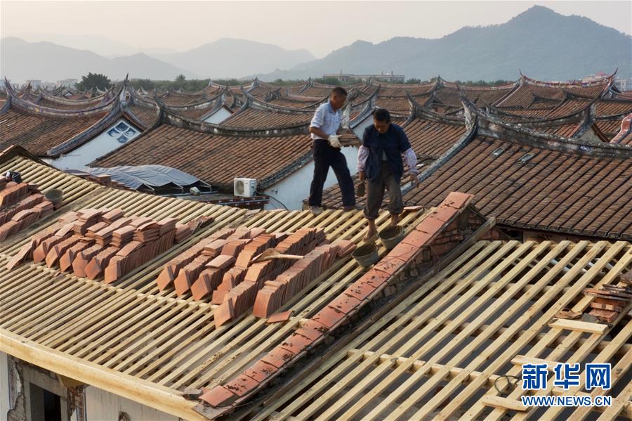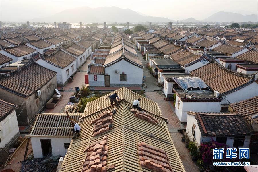 11月14日,埭美村村民在修繕一座古民居(無人機拍攝)。新華社記者姜克紅攝