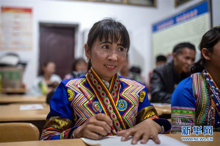 4月10日,在云南省勐??h布朗山鄉(xiāng)曼囡村曼班三隊(duì),娜四在村里上夜校。新華社記者胡超攝