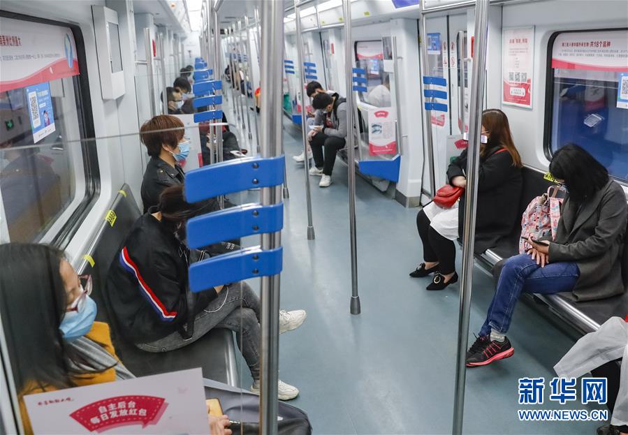4月22日,在武漢軌道交通一號線上,乘客間隔一定距離坐在車廂里。為建立與經(jīng)濟(jì)社會發(fā)展和疫情防控需要相適應(yīng)的運(yùn)輸服務(wù)保障機(jī)制,保障市民出行需求,從4月22日起,武漢城市公共交通有序恢復(fù)全線網(wǎng)運(yùn)營。新華社記者沈伯韓攝