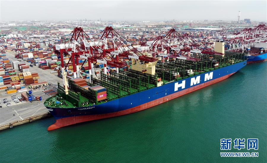 “現(xiàn)代商船阿爾赫西拉斯”輪靠泊在青島港前灣碼頭(無人機(jī)照片,4月26日攝)。當(dāng)日,載箱量可達(dá)2.4萬標(biāo)準(zhǔn)箱的世界最大集裝箱船“現(xiàn)代商船阿爾赫西拉斯”輪從山東青島港開啟首航,這條船的甲板面積超過2.4萬平方米,相當(dāng)于3.5個(gè)標(biāo)準(zhǔn)足球場(chǎng)大小。新華社記者李紫恒攝
