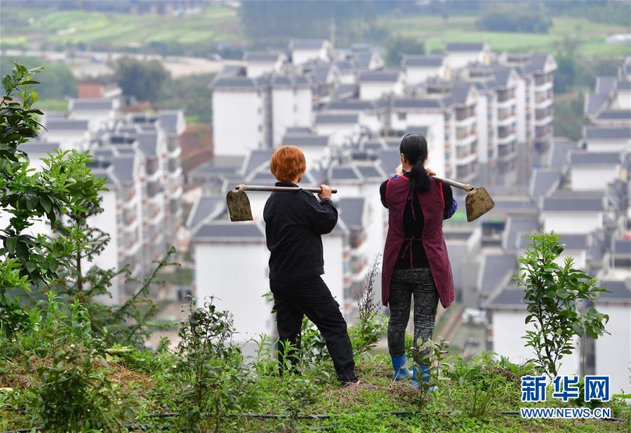在廣西融水苗族自治縣縣城一處易地扶貧搬遷小區(qū)附近,45歲的楊美燕(左)和搬遷戶楊鮮花在農(nóng)場(chǎng)里護(hù)理果樹(shù)(3月13日攝)。
