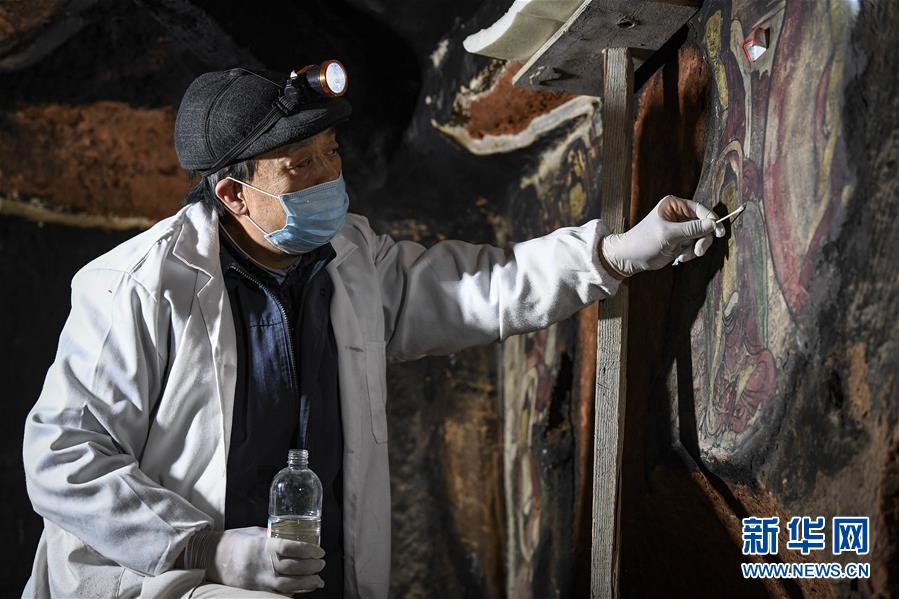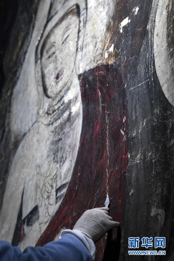 4月27日,文物修復專家在寧夏須彌山石窟圓光寺48號窟內(nèi)修復壁畫。新華社記者王鵬攝
