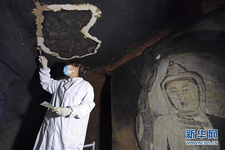 4月27日,文物修復專家在寧夏須彌山石窟圓光寺48號窟內(nèi)修復壁畫。新華社記者馮開華攝
