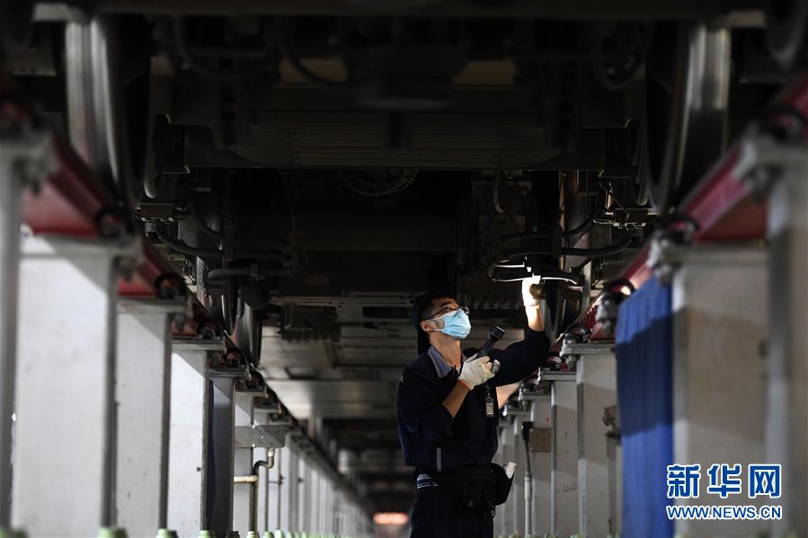 4月29日夜,合肥南動車運用所的工作人員對動車組進行檢修。每當(dāng)夜深人靜的時候,合肥南動車運用所卻燈火通明,“動車安全守護者”們堅守崗位,對動車組進行全面細致檢修。新華社記者 劉軍喜 攝