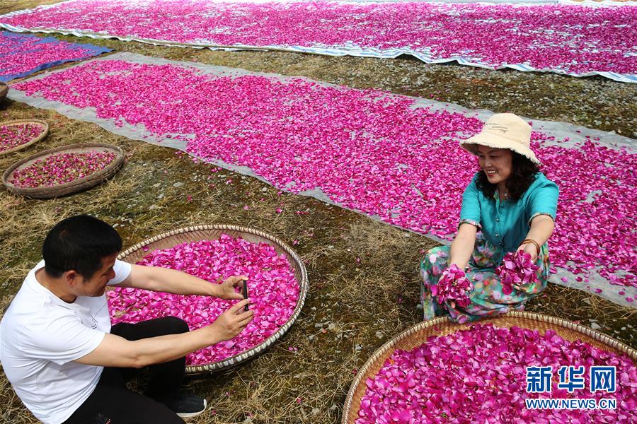 5月1日,游客在重慶市黔江區(qū)沙壩鎮(zhèn)天香玫瑰莊園體驗晾曬玫瑰花瓣?!拔逡弧奔偃掌陂g,人們以多種方式放松心情、享受假日。新華社發(fā)(楊敏攝)