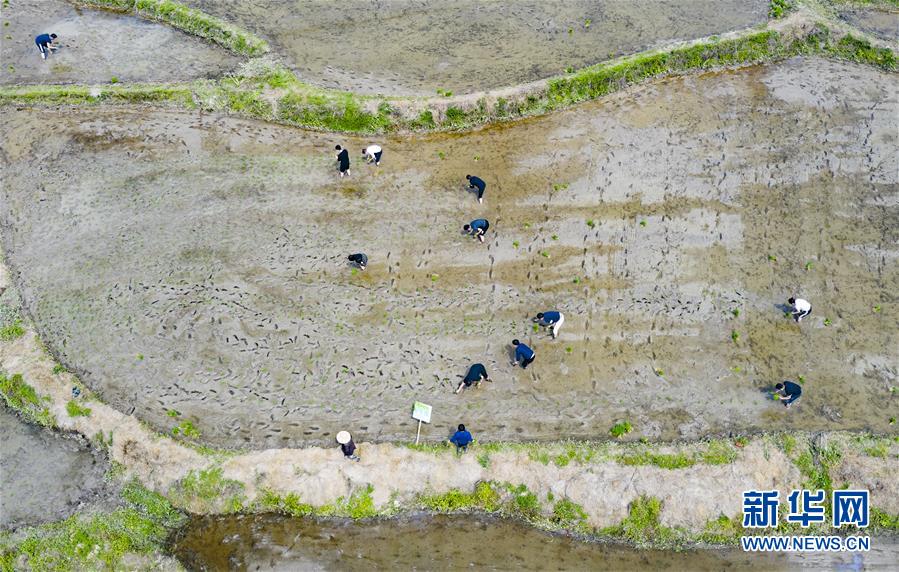 5月1日,游客在江西省新余市渝水區(qū)良山鎮(zhèn)下保村體驗農(nóng)耕樂趣(無人機拍攝)?!拔逡弧奔偃掌陂g,人們以多種方式放松心情、享受假日。新華社發(fā)(趙春亮攝)