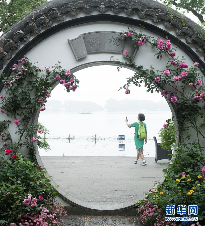 5月5日,游客在西湖畔的郭莊觀看月季花展?!拔逡弧逼陂g,第八屆杭州西湖月季花精品展在杭州西子湖畔舉行,展出國(guó)內(nèi)外700余個(gè)月季品種。新華社記者翁忻旸攝