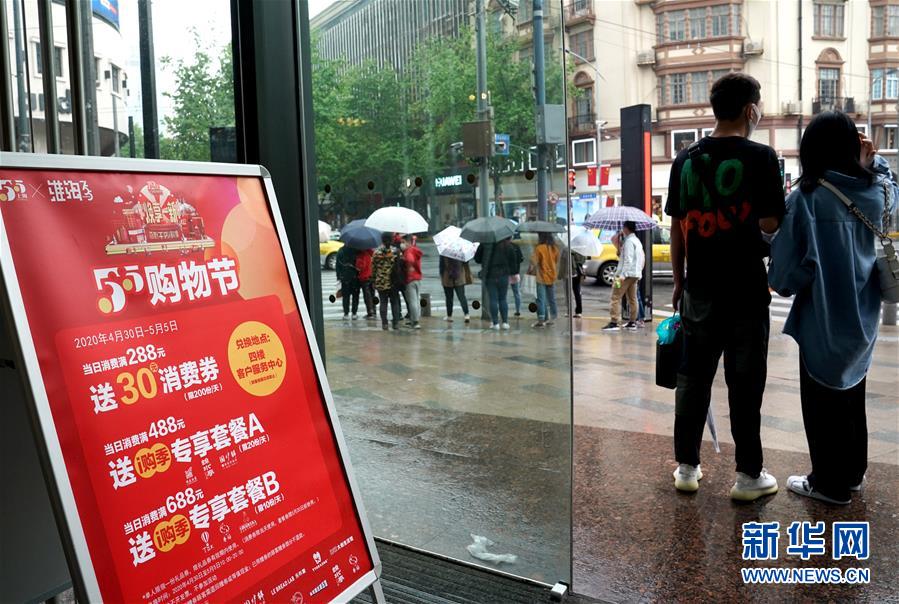 上?;春B芬患疑虉霾贾玫摹拔逦遒徫锕?jié)”活動信息(5月5日攝)。5月4日晚,上海首次啟動大規(guī)模商業(yè)促銷活動“五五購物節(jié)”,多家在線新經(jīng)濟(jì)企業(yè)參與,通過線上流量優(yōu)勢反哺線下賣場,實(shí)現(xiàn)電商與實(shí)體零售融合互動,激活消費(fèi)潛力、驅(qū)動消費(fèi)復(fù)蘇。據(jù)“上海發(fā)布”的消息,截至5日14時12分,“五五購物節(jié)”上海地區(qū)消費(fèi)支付總額已超100億元。新華社記者劉穎攝