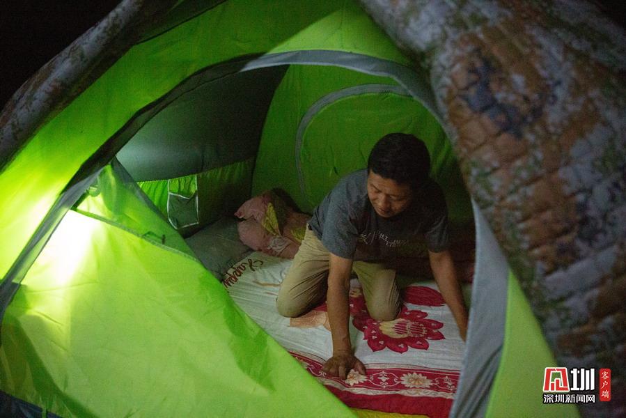 2020年5月3日,湖北省襄陽市,在南漳三道河水庫小島上,小島養(yǎng)蜂人趙德海忙碌了一天,晚上收拾帳篷準(zhǔn)備在島上入睡。