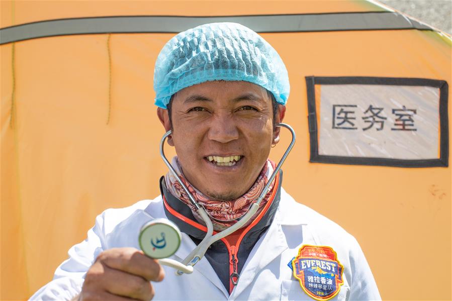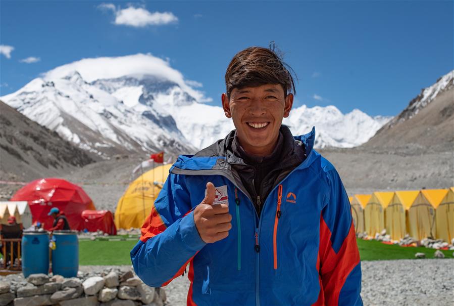 西藏圣山公司高山向?qū)赚旑D珠在珠峰大本營(5月8日攝)。5月8日是世界微笑日。在海拔5200米的珠峰大本營,參與2020珠峰高程測量的各方人員,微笑期待本次測量活動的圓滿成功。