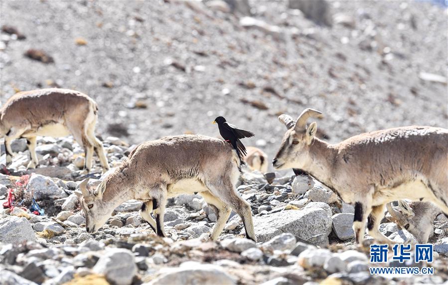 黃嘴山鴉停留在巖羊身上(5月8日攝)。當日,一群巖羊在珠峰大本營周圍覓食,黃嘴山鴉飛到巖羊身上停留,構(gòu)成一幅幅生動有趣的雪域圖畫。新華社記者晉美多吉攝