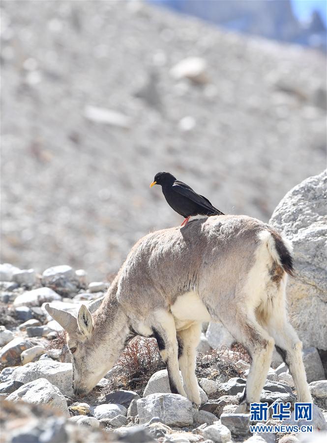 一只黃嘴山鴉停留在巖羊身上(5月8日攝)。當(dāng)日,一群巖羊在珠峰大本營周圍覓食,黃嘴山鴉飛到巖羊身上停留,構(gòu)成一幅幅生動(dòng)有趣的雪域圖畫。新華社記者晉美多吉攝