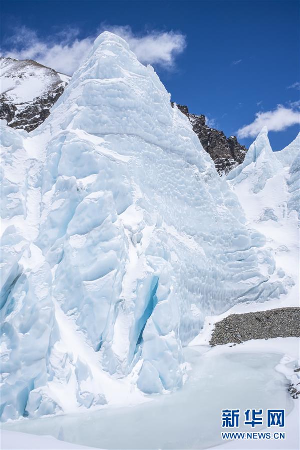 珠峰海拔5800米至海拔6500米的冰塔林(5月9日攝)。從海拔5800米的珠峰過渡營(yíng)地到海拔6500米的前進(jìn)營(yíng)地,冰塔林沿山谷排列,蔚為壯觀。新華社記者孫非攝