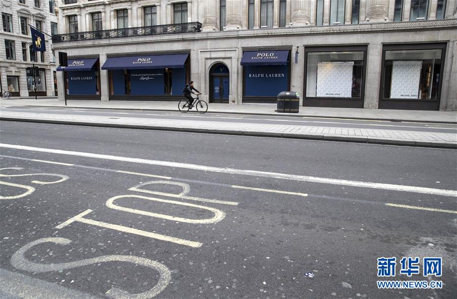 5月12日,在英國(guó)倫敦,一名男子騎行經(jīng)過(guò)攝政街關(guān)閉的店鋪。新華社記者韓巖攝
