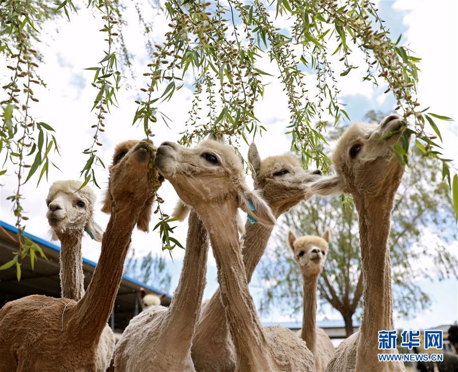 5月12日,幾只剪下絨毛的羔羊駝在養(yǎng)殖基地的飼養(yǎng)舍里。新華社記者姚劍鋒攝