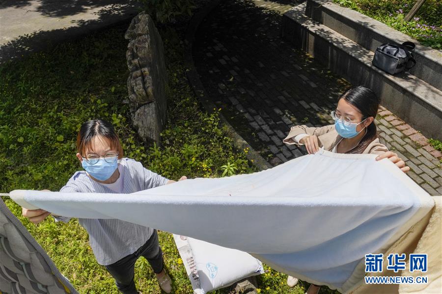 5月15日,在西南大學(xué)一棟宿舍樓下,一名返校大學(xué)生(左)在輔導(dǎo)員老師的幫助下曬被子。當(dāng)日,重慶西南大學(xué)迎來疫情以來首批返校大學(xué)生。據(jù)介紹,按照疫情防控的需要,重慶市高校2020年春季學(xué)期從5月11日起按照“一校一策”原則,實行錯峰錯時分批次有序開學(xué)復(fù)課。新華社記者劉潺攝