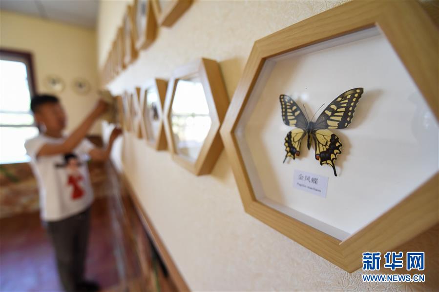 在吉木薩爾縣七彩蝶園,關(guān)富云在打掃蝴蝶標(biāo)本展廳(5月15日攝)。新華社記者丁磊攝