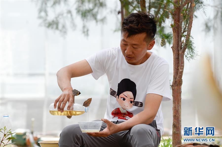 在吉木薩爾縣七彩蝶園,關(guān)富云查看蝶蛹生長(zhǎng)狀況(5月15日攝)。新華社記者丁磊攝