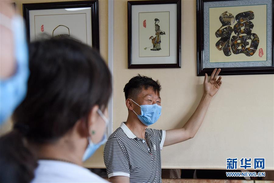 在吉木薩爾縣七彩蝶園,關(guān)富云向游客介紹蝶翅畫(huà)作品(5月14日攝)。新華社記者丁磊攝