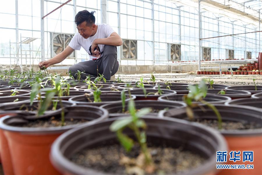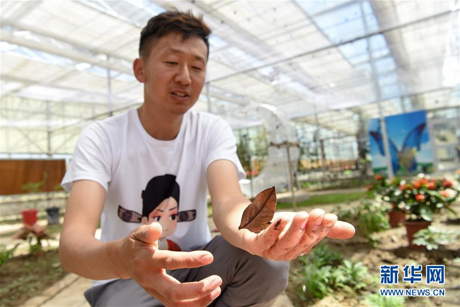 在吉木薩爾縣七彩蝶園,關(guān)富云在查看蝴蝶幼蟲(chóng)的寄主植物生長(zhǎng)情況(5月15日攝)。新華社記者丁磊攝