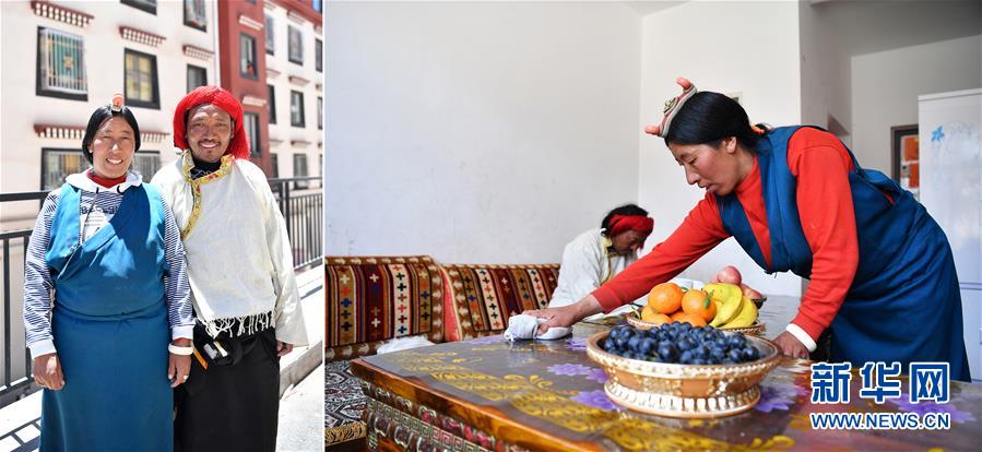 拼版照片:左圖為西藏昌都市八宿縣擁巴鄉(xiāng)娜帕村村民布貢(右)和妻子益西瓊措在安置點(diǎn)樓前;右圖為在八宿縣乃然易地扶貧搬遷安置點(diǎn),益西瓊措在家里打掃衛(wèi)生。2018年,布貢一家人搬遷到乃然易地扶貧搬遷安置點(diǎn),住進(jìn)了三室一廳的新居。和布貢一家一樣,八宿縣擁巴鄉(xiāng)、夏里鄉(xiāng)、瓦鄉(xiāng)的2000余名群眾完成易地搬遷,開(kāi)啟美好的新生活(5月10日攝)。新華社記者詹彥攝