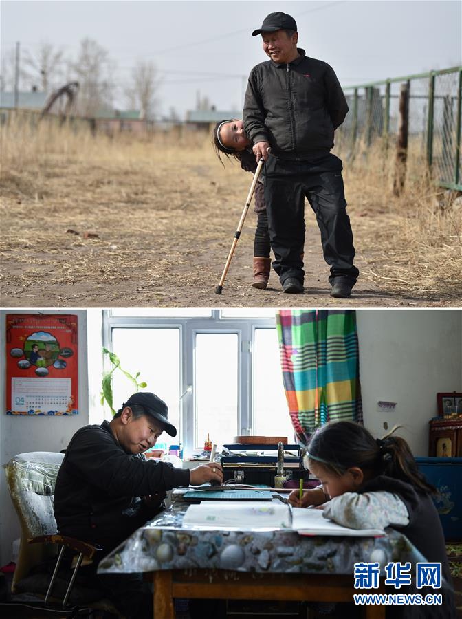 拼版照片上圖:在錫尼河鎮(zhèn)的出租房外,米格木爾(前)和女兒南吉樂瑪一起玩耍;下圖:在錫尼河鎮(zhèn)的出租房內(nèi),米格木爾在進(jìn)行皮雕,女兒南吉樂瑪在溫習(xí)功課(照片均攝于4月15日)。2016年,家住內(nèi)蒙古鄂溫克族自治旗錫尼河鎮(zhèn)孟根礎(chǔ)魯嘎查的米格木爾因?yàn)槿笔趧?dòng)能力成了建檔立卡貧困戶。獨(dú)自撫養(yǎng)女兒的他為了女兒上學(xué)離開了牧區(qū)來到鎮(zhèn)上租房陪讀,生活的壓力讓米格木爾犯了難。2018年春天,他通過當(dāng)?shù)孛褡逦幕a(chǎn)業(yè)創(chuàng)業(yè)園舉辦的皮雕手藝培訓(xùn),讓他居家賺錢、陪讀兩不誤,逐步實(shí)現(xiàn)穩(wěn)定脫貧。2020年4月,我國第一個(gè)成立的少數(shù)民族自治區(qū)——內(nèi)蒙古自治區(qū)宣告全面脫貧“摘帽”。黨的十八大以來,我們堅(jiān)持以人民為中心的發(fā)展思想,明確了到2020年我國現(xiàn)行標(biāo)準(zhǔn)下農(nóng)村貧困人口實(shí)現(xiàn)脫貧、貧困縣全部摘帽、解決區(qū)域性整體貧困的目標(biāo)任務(wù)。目前看,脫貧進(jìn)度符合預(yù)期,成就舉世矚目。這些成績的取得,凝聚了全黨全國各族人民智慧和心血,是廣大干部群眾扎扎實(shí)實(shí)干出來的。脫貧摘帽不是終點(diǎn),而是新生活、新奮斗的起點(diǎn)。新華社記者劉磊攝