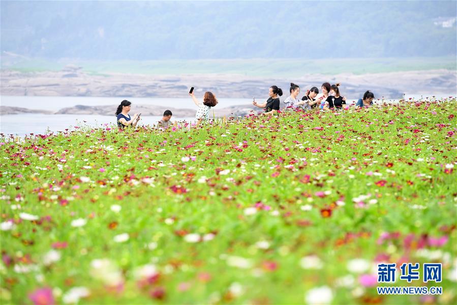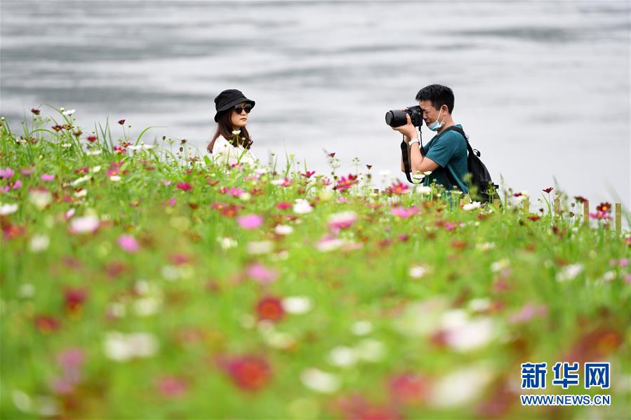 5月20日,在重慶市巴南區(qū)木洞鎮(zhèn)長江岸邊,游客在格桑花海中游玩。近日,重慶市巴南區(qū)木洞鎮(zhèn)長江岸邊的格?;ǜ傁嚅_放,吸引游客前來賞花觀景。新華社記者唐奕攝