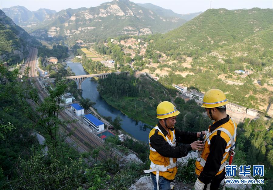 5月21日,捅山工胡軍(左)與張磊互相檢查安全繩捆綁情況。新華社記者郝源攝