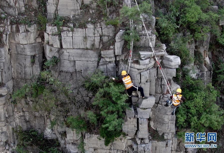 5月21日,捅山工胡軍從山頂垂降,準(zhǔn)備開(kāi)始捅山作業(yè)。新華社記者郝源攝