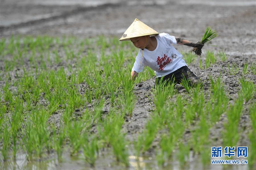 5月24日,一名小朋友在稻田里插秧。當(dāng)日,十余名小朋友在家長(zhǎng)的帶領(lǐng)下來到浙江省湖州市吳興區(qū)八里店鎮(zhèn)尹家圩糧油植保農(nóng)機(jī)專業(yè)合作社的稻田中,參加親子插秧、稻田捉魚等農(nóng)事體驗(yàn)活動(dòng)。新華社記者黃宗治攝