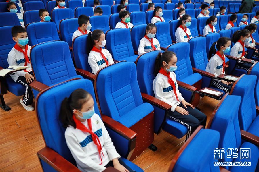 5月25日,廣州市荔灣區(qū)蔣光鼐紀念小學的學生在參加升國旗唱國歌儀式。當日,廣州市各小學一至三年級學生正式開學復課。至此,廣州市中小學各年級已全部開學復課。新華社記者盧漢欣攝