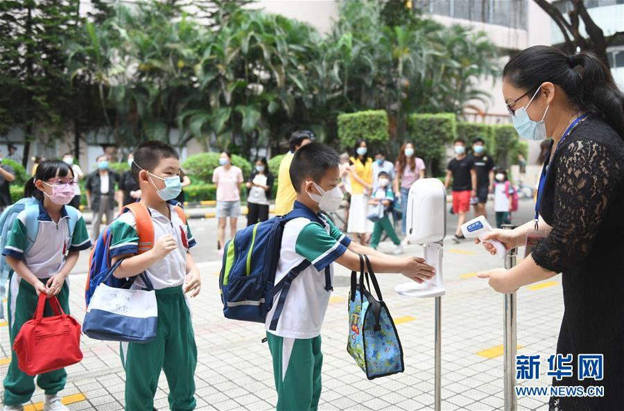 5月25日,廣州市荔灣區(qū)蔣光鼐紀念小學的老師在校門口指導返校的學生進行手部消毒。當日,廣州市各小學一至三年級學生正式開學復課。至此,廣州市中小學各年級已全部開學復課。新華社記者盧漢欣攝