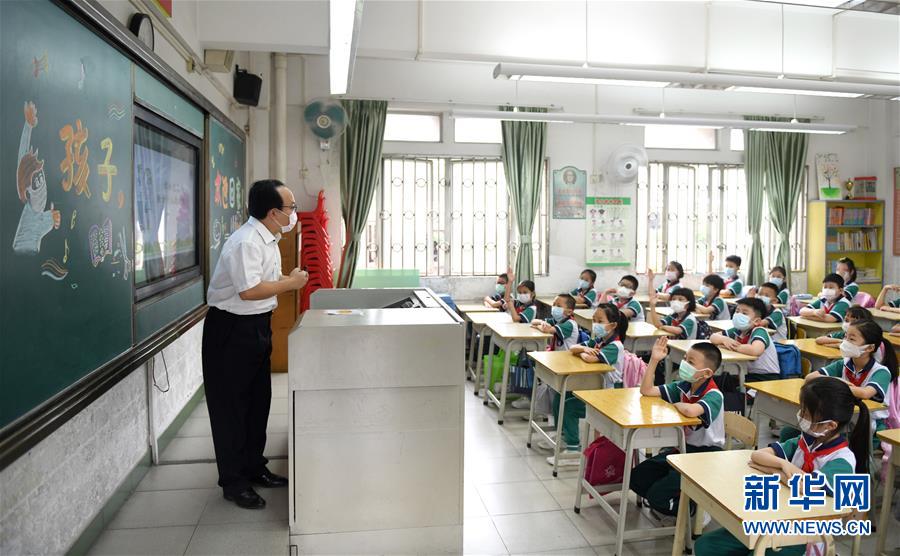 5月25日,廣州市荔灣區(qū)蔣光鼐紀念小學的老師在給學生上開學第一課。當日,廣州市各小學一至三年級學生正式開學復課。至此,廣州市中小學各年級已全部開學復課。新華社記者盧漢欣攝