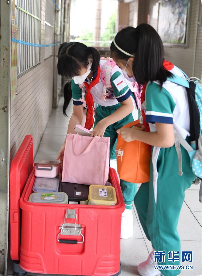 5月25日,廣州市荔灣區(qū)蔣光鼐紀(jì)念小學(xué)的學(xué)生將自帶的飯盒放在教室門口的箱子里,工作人員將為學(xué)生統(tǒng)一配餐。當(dāng)日,廣州市各小學(xué)一至三年級學(xué)生正式開學(xué)復(fù)課。至此,廣州市中小學(xué)各年級已全部開學(xué)復(fù)課。新華社記者盧漢欣攝