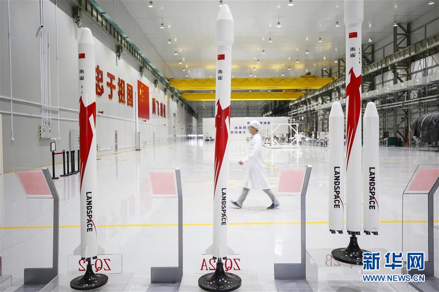 5月26日,工作人員走過藍箭航天智能制造基地發(fā)動機裝配區(qū)內(nèi)的火箭模型。新華社記者張玉薇攝