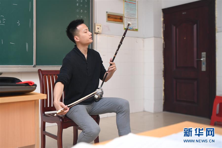 在湖南省湘西土家族苗族自治州,戴發(fā)在瀘溪縣第五中學(xué)教室內(nèi)演奏二胡(5月22日攝)。新華社記者薛宇舸攝