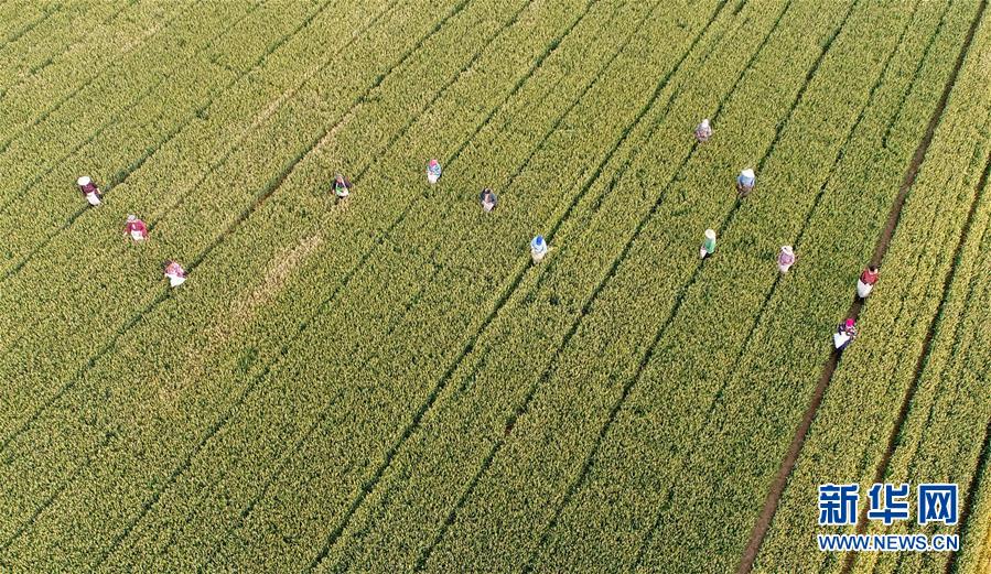 5月26日,農(nóng)民在內(nèi)丘縣東龐前街村麥田清理雜麥(無人機照片)。夏日時節(jié),河北省邢臺市內(nèi)丘縣農(nóng)民搶抓農(nóng)時開展麥田后期管理,為小麥增產(chǎn)豐收打好基礎(chǔ)。新華社記者朱旭東攝