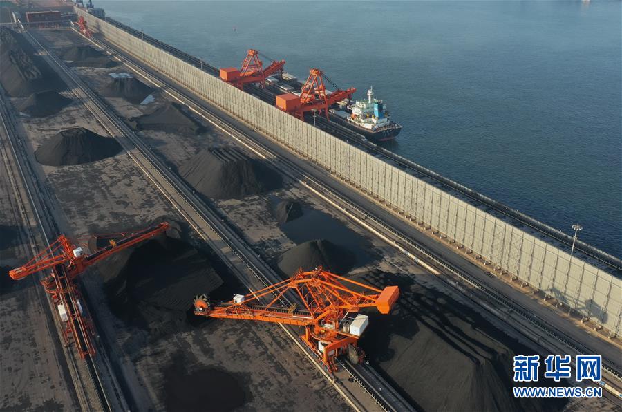 5月22日,一艘輪船靠泊在唐山港曹妃甸港區(qū)煤碼頭三期工程的先期工程泊位裝貨(無人機照片)。新華社記者楊世堯攝