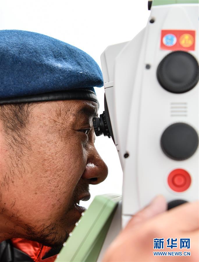 自然資源部第一大地測(cè)量隊(duì)隊(duì)員鄭林在使用全站儀對(duì)珠峰峰頂進(jìn)行交會(huì)觀測(cè)(5月27日攝)。