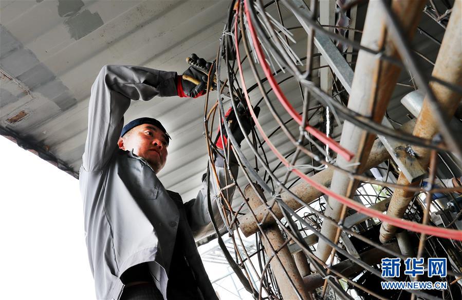 5月27日,制作團(tuán)隊成員李剛在中轉(zhuǎn)服務(wù)站工棚內(nèi),用廢舊鋼絲制作牛造型工藝品的身體部分。新華社記者方喆攝